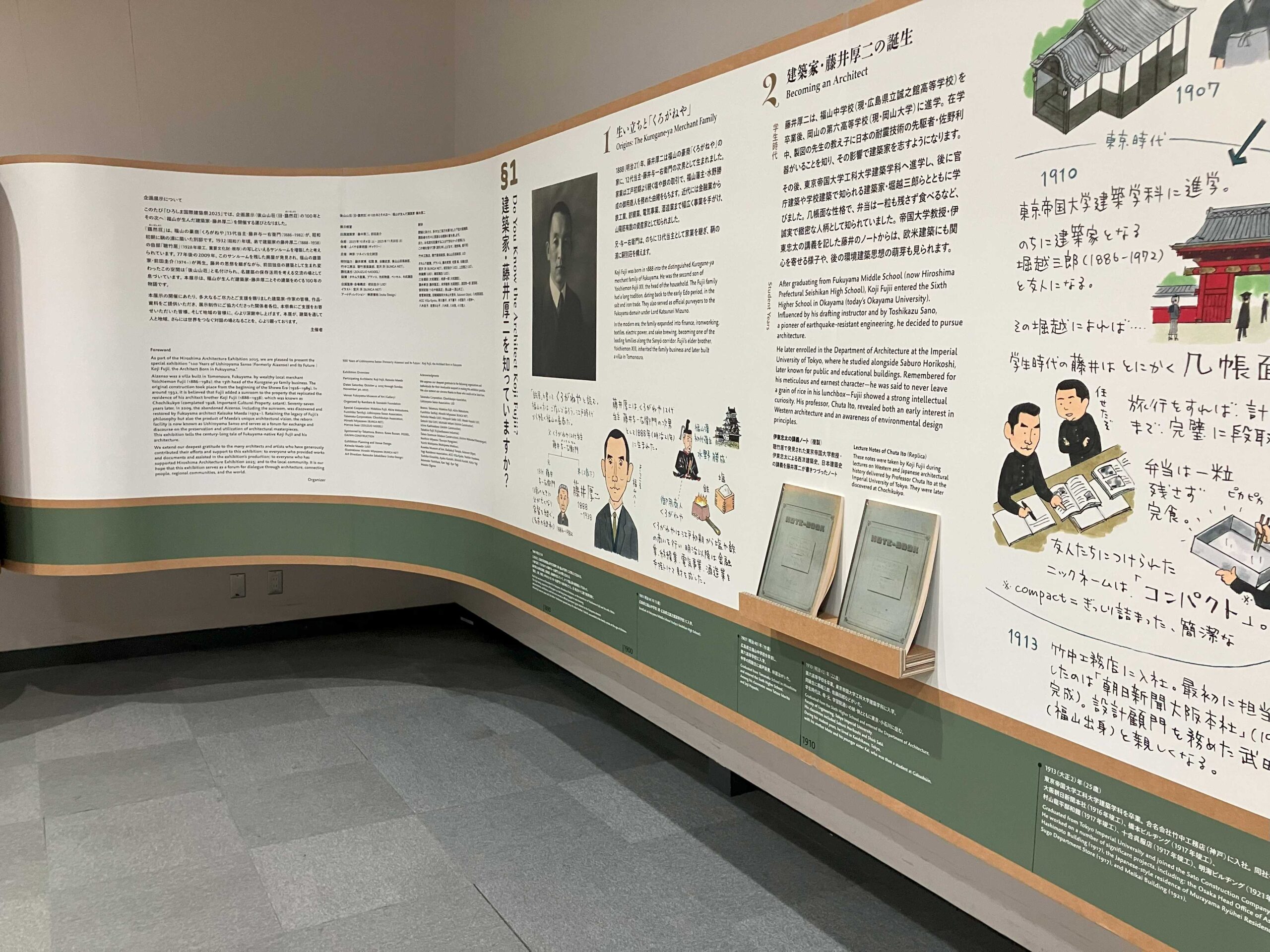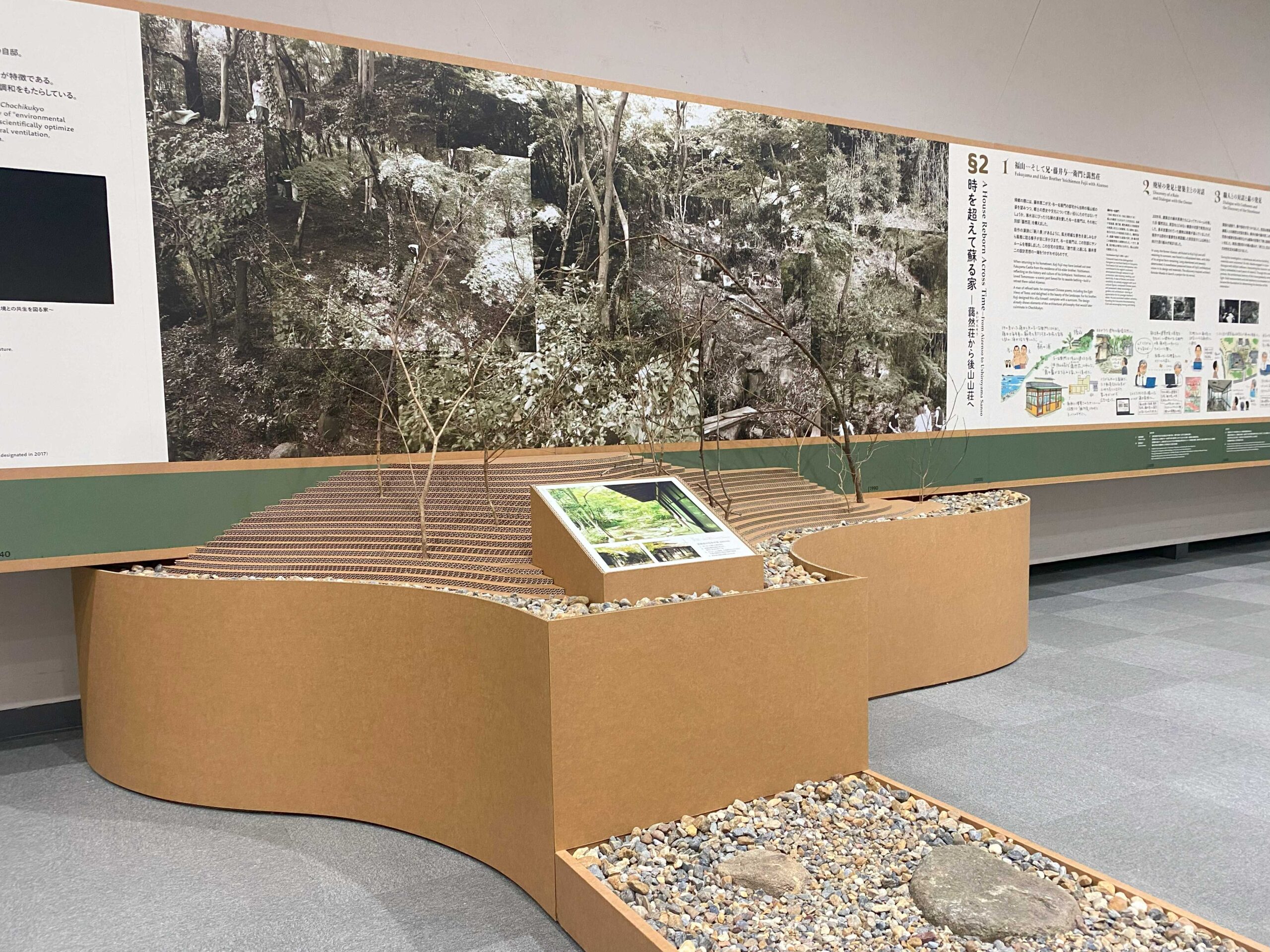 その内 1 つ、「後⼭⼭荘(旧・藹然荘(あいぜんそう))の 100 年とその次へ|福⼭が⽣んだ建築家・藤井厚⼆」@ふくやま美術館の展⽰台ご紹介致します。