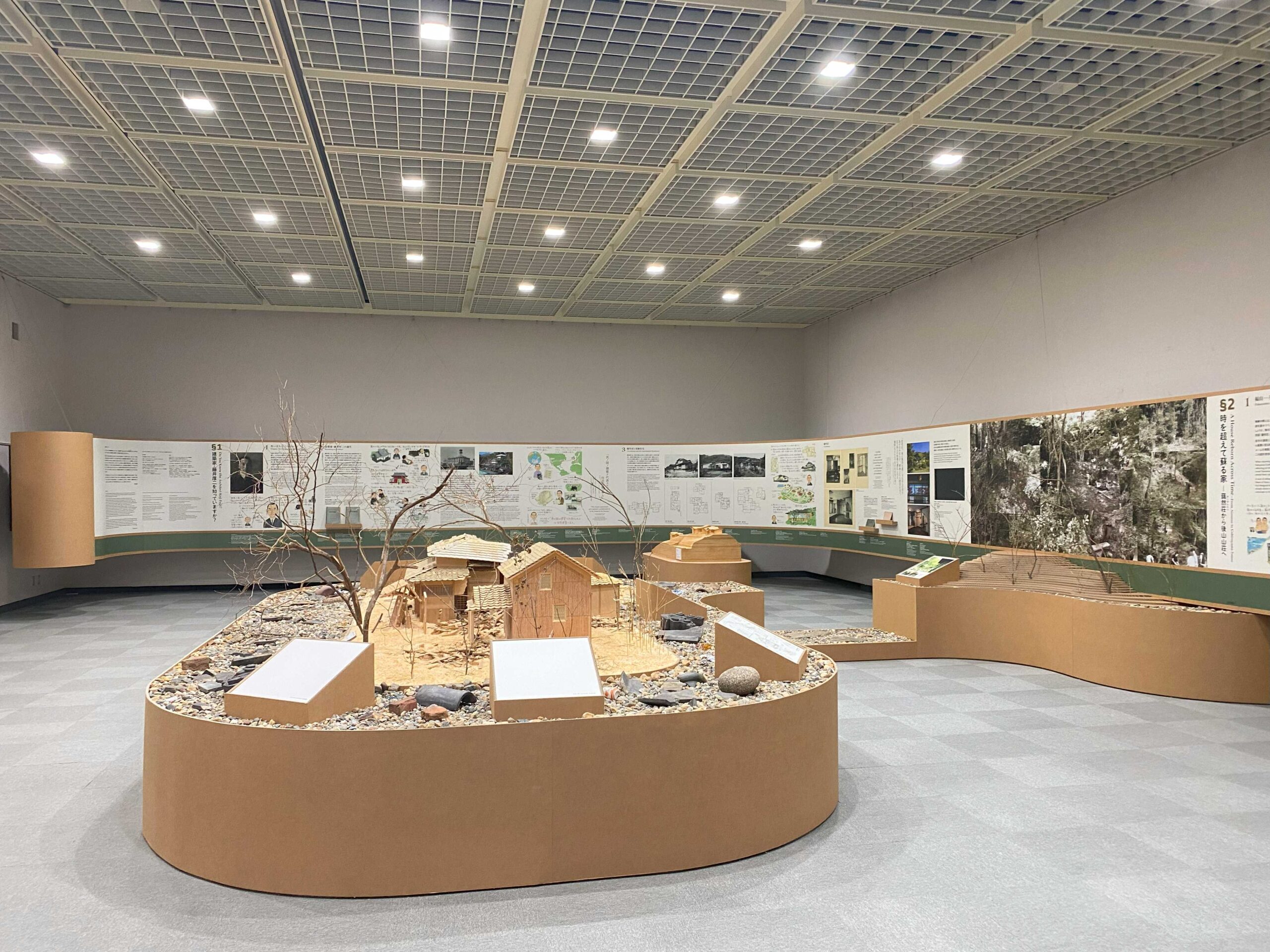 今回タカムラ産業では、絵巻物⾵壁什器、模型飾るダンボール展⽰台を担当いたしました。